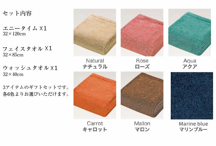 (あす楽対応不可) <セット内容> エニータイム(32×120cm)☓1 フェイスタオル(32×85cm)☓1 ウォッシュタオル(32×40cm)☓1 ・サイズ: エニータイム(32×120cm) フェイスタオル(32×85cm) ウォッシュタオル(32×40cm) ・原材料:綿92% デオセル(消臭糸)8% ・原産国:日本製 納期につきましては余裕を持って記載させていただいておりますが多少前後する可能性がございますのでご了承の程、お願い致します。