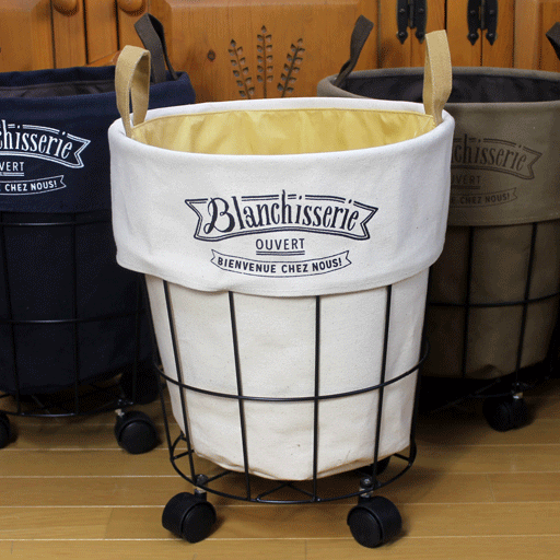 【かご1000点即日発送】中を隠せる 巾着袋式♪キャスター付ランドリーボックス(ラウンド)<アイボリー・ネイビー・ベージュ> 25L直径33.5×h40(取っ手含まず)【洗濯/おもちゃ/収納/隠せる収納】
